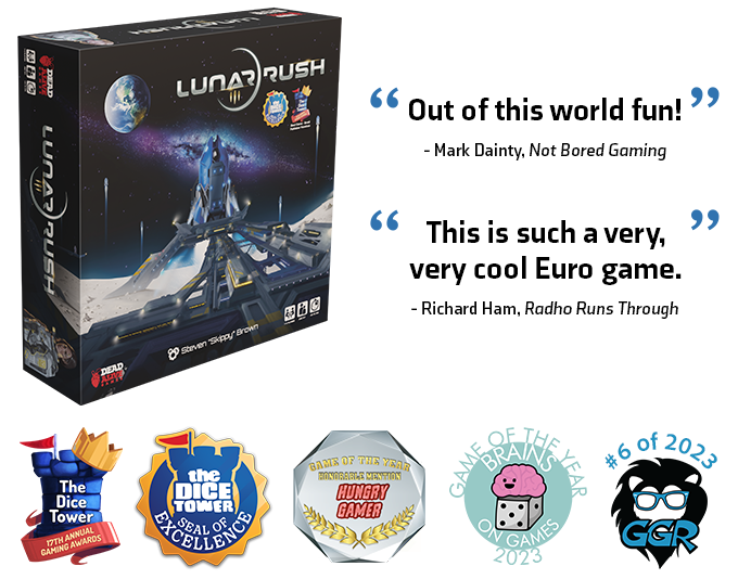 Lunar Rush is an award-winning simultaneous-play Euro game that blends time-based resource management, market economics, bidding, and tableau-building into a refreshing new genre. It has earned the Dice Tower Seal of Excellence, was nominated for Dice Tower’s Best Game from a Small Publisher, appeared on multiple Top 10 Games of 2023 lists, and holds a 7.7 rating on BoardGameGeek.