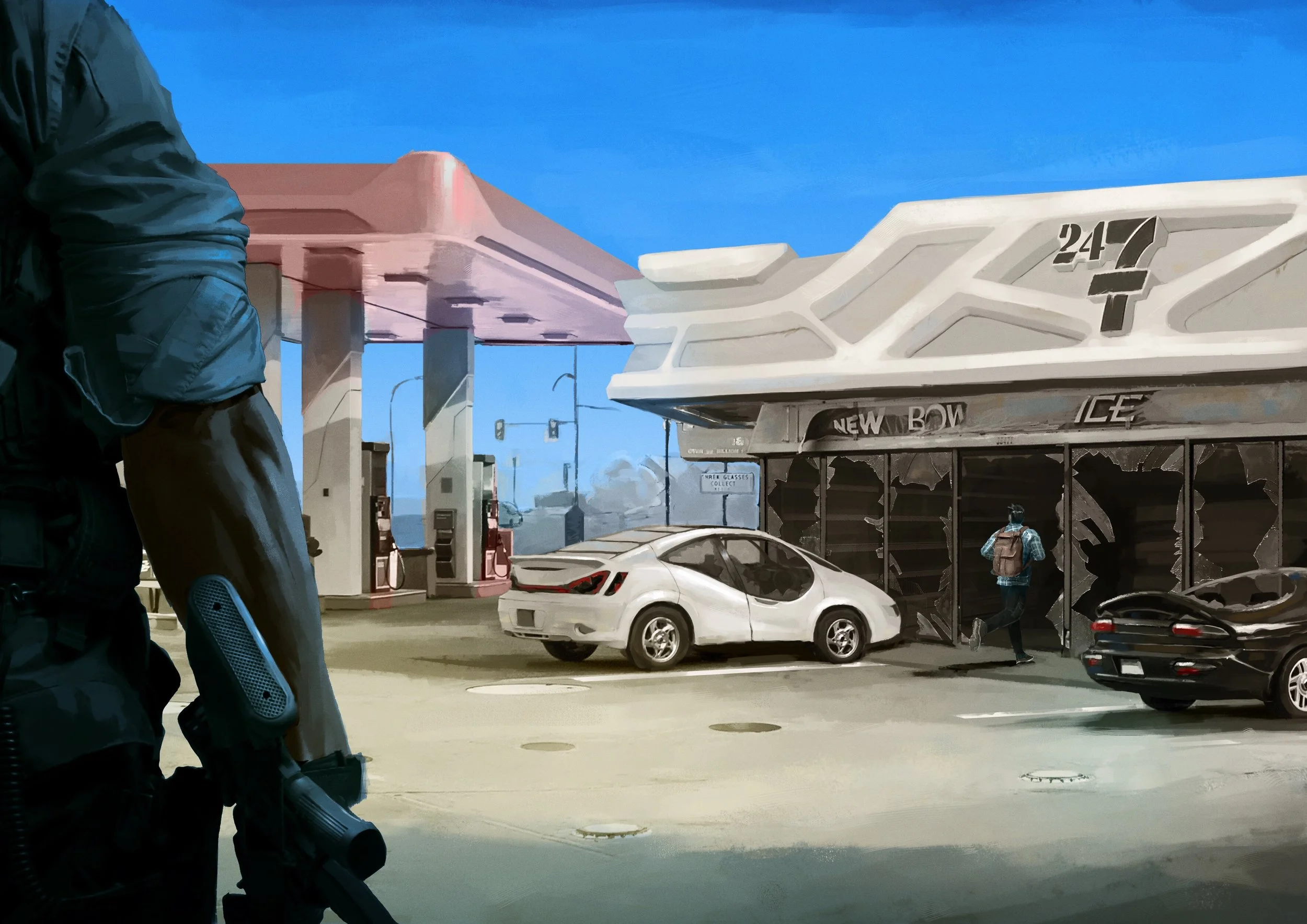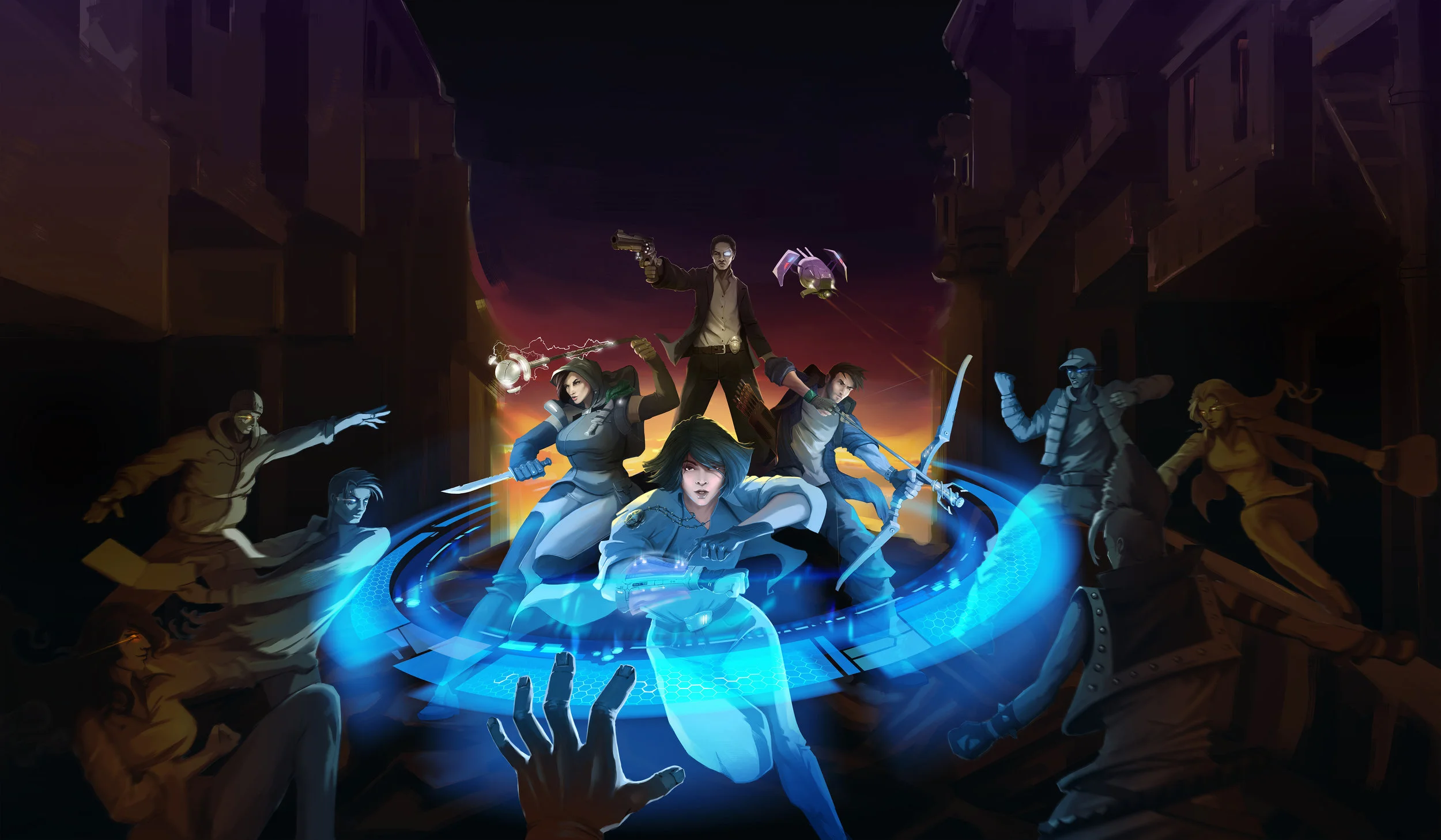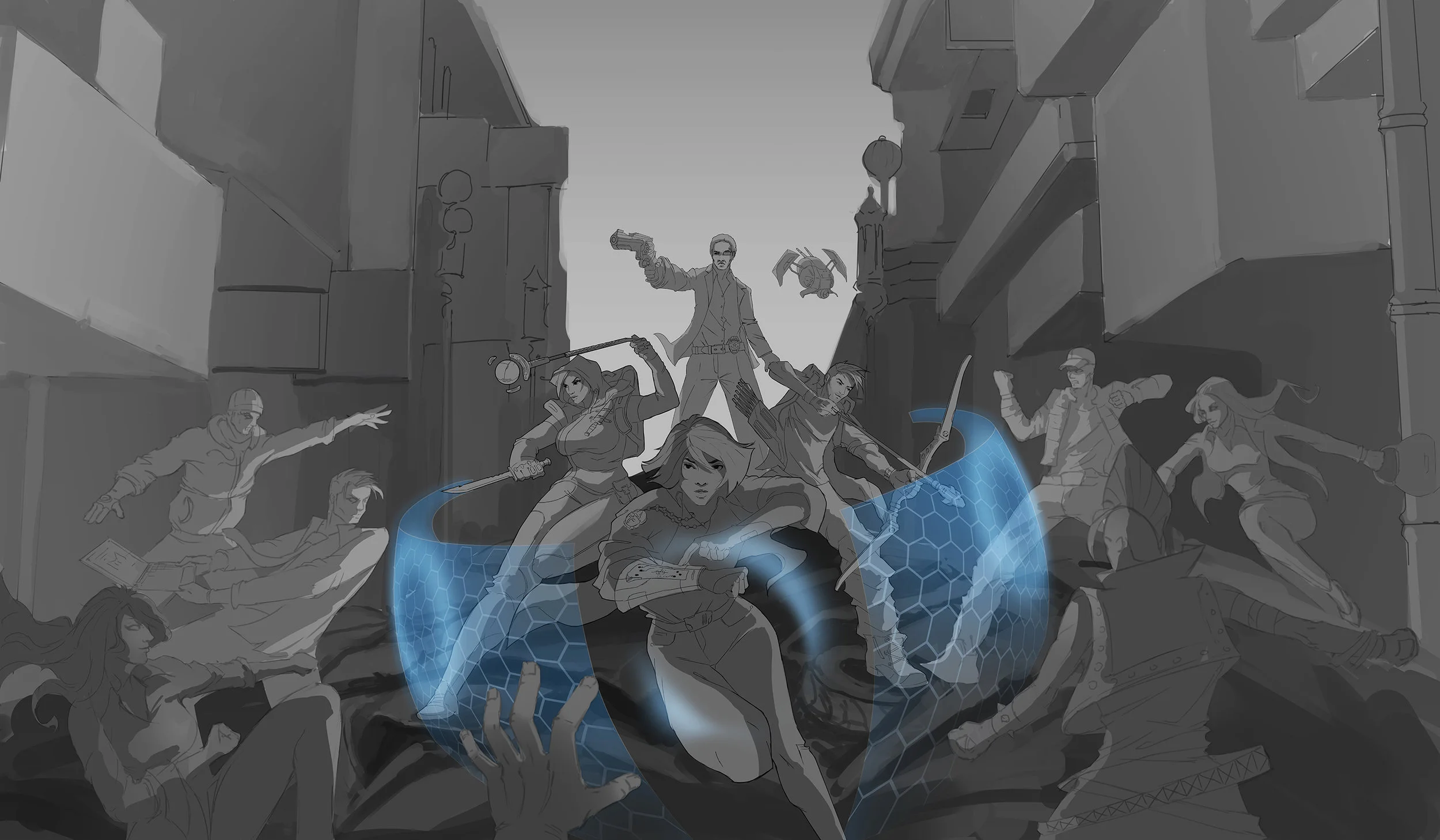 We knew we wanted a detailed illustration with which we would be able to make post cards, banners, flyers, and ads; Something that immediately communicates to people who don’t know about Omicron Protocol what this game is about. We wanted it to feature 4 of our characters front and central, and also give a glimpse of the city that is slowly falling apart. After discussing with Viktor, we decided to feature Pai, Lucky, Seeker, and Flash, partially because they would totally find themselves in this situation in our stories, and partially because Brendan and I just love these 4 characters so much.